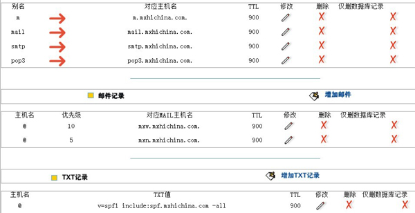 功能:電子郵件系統發郵件時根據收信人的地址后綴來定位郵件服務器。例如,當收件人為“user@mydomain.com”時, 系統將對“mydomain.com”進行DNS中的MX記錄解析。如果MX記錄存在,系統就根據MX記錄的優先級,將郵件轉發到與該MX相應的郵件服務器上。