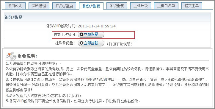 點擊“備份/恢復”,選擇“恢復上次備份”,即可將系統和數據恢復到上次備份的狀態,(注意:恢復之前請講重要數據備份到您本地,并先看下“備份VHD文件修改時間”,并確認下是否有掛載過備份盤,以免恢復的數據不是您以前的備份數據導致數據丟失!)如圖: