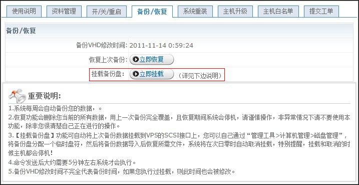 選擇“掛載備份盤”,即可將上次的備份掛載到您的系統下,掛載將會在次日凌晨取消,掛載操作和取消操作將會重啟您的服務器。掛載操作后備份的VHD修改時間將會發生變化,若要恢復備份到掛載前,請備份好數據,謹慎選擇。如圖:
