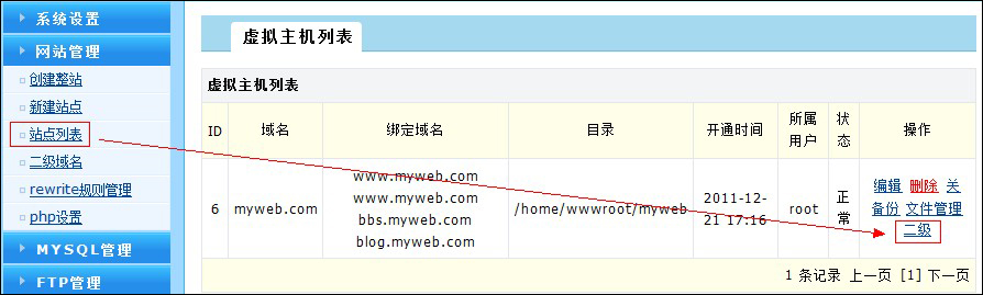 最后點擊確定,就建立好了一個二級域名的站點。 wdcp3.2版本: 首先登錄WDCP管理面板,點擊左側的“網站管理”——“站點列表”,在站點列表選擇您要綁定二級域名的站點,點擊右側的“二級”,如圖: