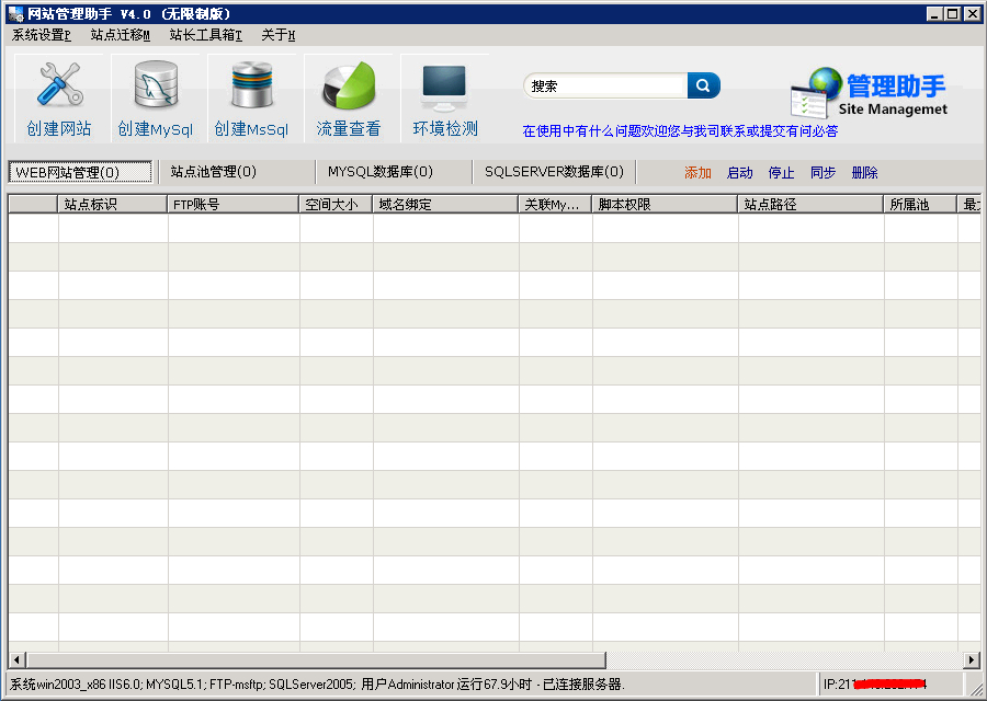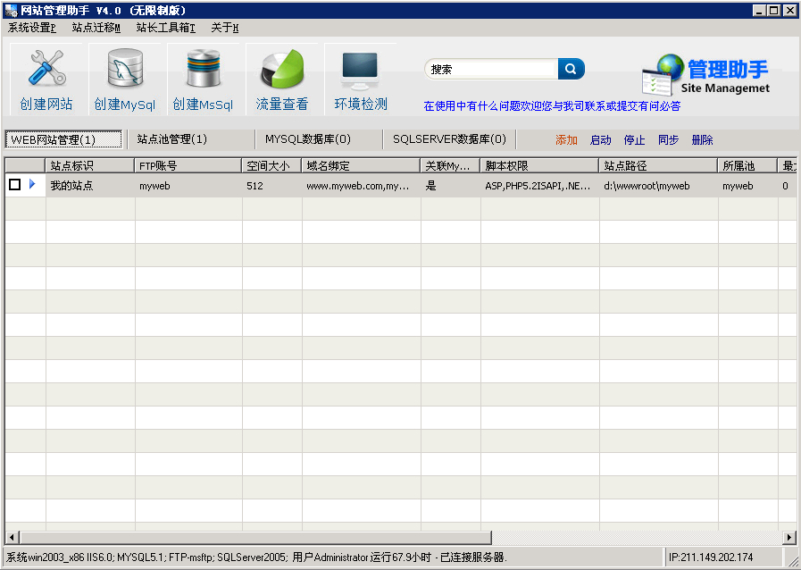 最后點“確認創建”就新建完一個站點了。 提示框提示“MYSQL創建結果:Ture”表示mysql創建成功,若mysql創建失敗,請檢查mysql服務是否正常啟動或系統 設置中mysql的路徑是否正確。