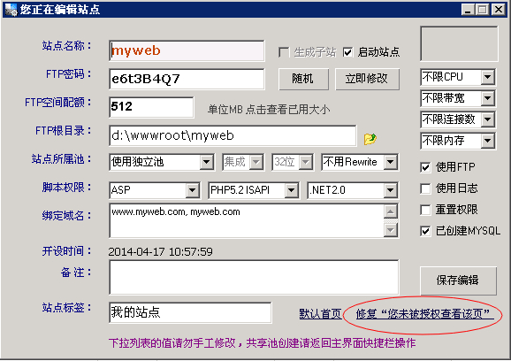 站點名稱:填寫一個FTP賬號,可以是英文(建議小寫)和數字的組合 FTP密碼:建議保持默認或自己設定一個容易記住但比較復雜的密碼,切勿用FTP賬號做密碼。 FTP空間配額:建議保持默認設置 FTP個目錄:建議保持默認設置 站點所屬池:建議保持默認設置 腳本權限:如果是asp程序,請將php_isapi修改為“無”; 如果是PHP程序,請將ASP修改為“無”; 如果是ASP.NET程序,請將ASP修改為“無”,請將PHP_ISAPI修改為“無”,請將“不使用asp.net”修改為 您需要的版本,如asp.net2.0 。 如果您對腳本權限概念不熟悉,請保持默認設置。 偽靜態組件:PHP程序請在下拉菜單選擇對應規則,如果沒有找到對應的,請選擇自定義,保存配置后進入您站點的 others目錄下,修改httpd.conf中的規則即可。ASP和ASP.NET程序建議保持默認設置(不使用)