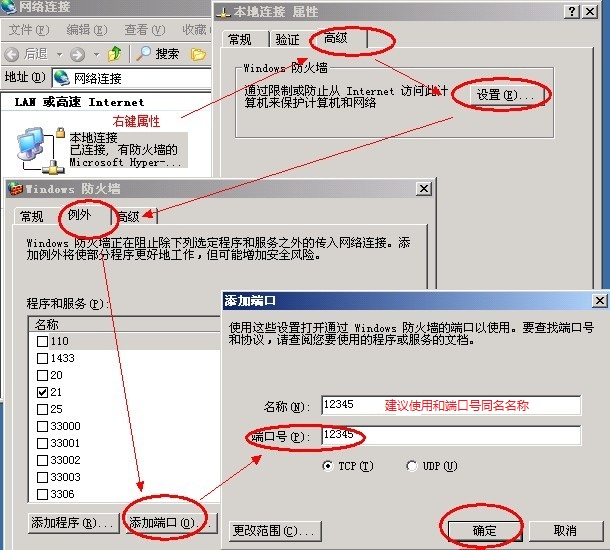 在防火墻設置中,選擇“例外”,添加需要開啟的遠程端口號(注:12345為示范端口),整個操作如圖所示: