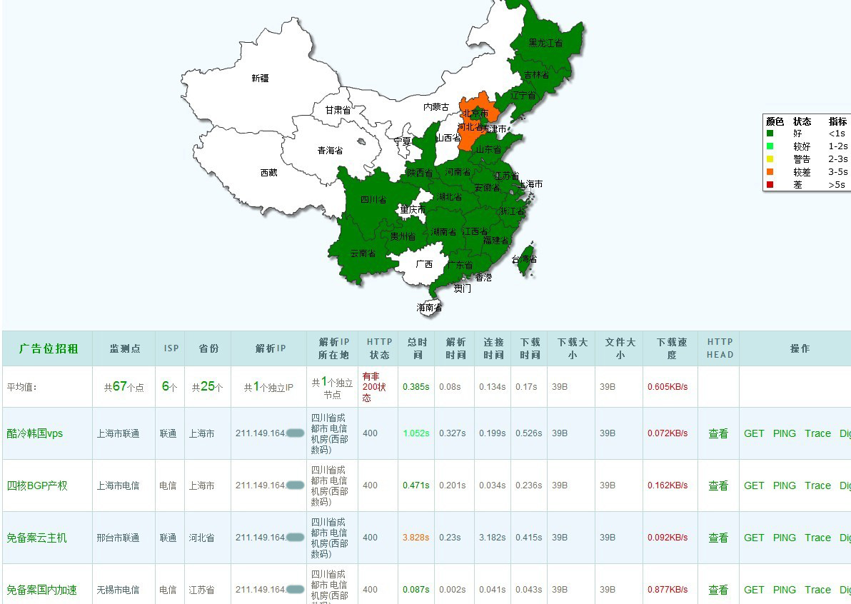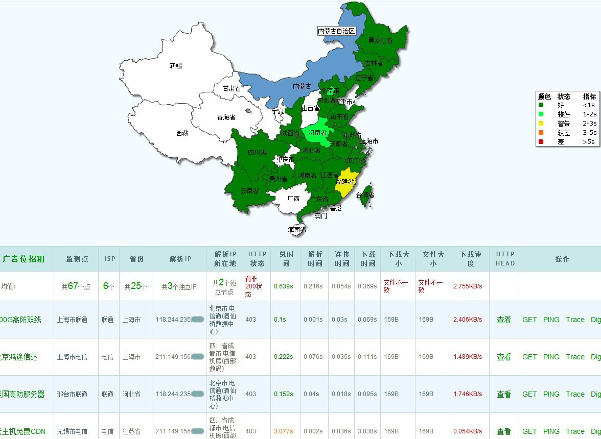 問:3M帶寬,要滿足每個客戶能達到100K/s的訪問開放式,是否只支持3個人同時在線? 答:實際環境中,客戶的訪問請求不可能在同一秒同時達到,而是錯開的。所以3M帶寬也可以支持不小的訪問量。具體能支持多少,要看網頁、圖片的大小以及客戶訪問的頻率等實際情況。 問:為什么其他網站比如新浪、百度這些網站測試出來的速度這么快? 甚至我另外一個網站用的你們的虛擬主機測試出來也比放在彈性云上面的網站速度要快? 答:新浪、百度等網站的帶寬資源都非常豐富,當然成本也與一臺彈性云主機的成本不可同日而語。 虛擬主機一般是根據月流量限制的,并未限制峰值。虛擬主機的服務器一般是100M或1000M的帶寬,所以用www.17ce.com等平臺測試時,幾十個節點并不能把服務器的帶寬占滿,因而能測試出真實的速度。 彈性云如果購買的帶寬比較小,在測試時帶寬已經占滿了,服務器線路當時處于非常擁堵的狀態。如果購買的帶寬非常充裕,應該不會出現這種情況。 問:那如何測試彈性云主機的速度? 答:在服務器的網站目錄放置一個較大的壓縮包,在您的電腦上用“迅雷”下載它,應該可以測試出您的電腦連接到彈性云主機的速度。假設您的彈性云是2M帶寬,您的電腦是4M adsl,那么下載速度應該在2Mbps; 如果您的彈性云是10M帶寬,您的電腦是4M adsl,下載速度應該為4Mbps. 提供一個測試網址: cloudsppedtest.gotoip3.com (采用智能多線,10M帶寬),可用于17ce測試對比。 下面幾則圖例可以充分說明,17ce上測試出來狀況是否良好,跟主機的帶寬有直接關系!即使是阿里云機房或我們提供的北京BGP機房,如果帶寬很低,同樣測試出來的效果很差。 用三五互聯智能多線機房2M帶寬測試出來全線飄紅的問題,在您升級為10M或更多帶寬的情況下,就可能實現很好的測試效果。但如果換為我們的北京BGP機房仍是2M帶寬,同樣測試效果會不理想。 另外測試中出現一個現象:同樣是2m的主機,首次測出來很差,但稍后再測的時候就全線變綠了,這可能跟17ce的服務器有了緩存的原因。 圖一:阿里云主機,2M帶寬 圖2:三五互聯智能多線 10M帶寬