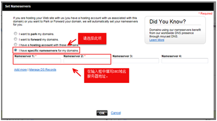 5、在彈出層的輸入框中填寫您的域名DNS服務器地址,點擊【OK】即可完成設置。