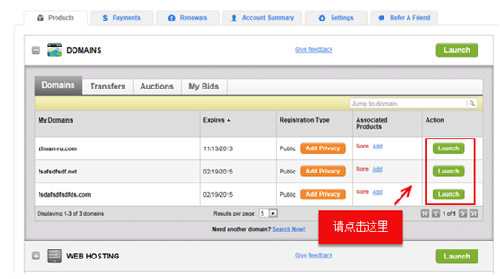 3、展開域名列表后,找到需要修改DNS的域名,點擊對應的【Launch】按鈕。