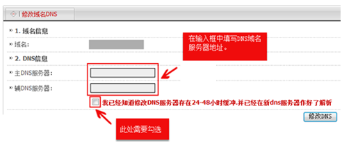 5、在輸入框中填寫(xiě)域名DNS服務(wù)器地址,并勾選“我已經(jīng)知道……”協(xié)議后點(diǎn)擊【修改DNS】按鈕。