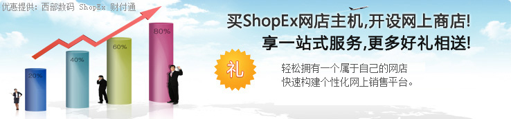 | ShopEx網店主機是我司做為國內著名網店系統開發商ShopEx金牌合作伙伴向廣大電子商務客戶推出的新一代網店系統。使您輕松擁有一個屬于自己的網店。幫助企業及個人為開展電子商務而快速構建個性化網上銷售平臺。 |