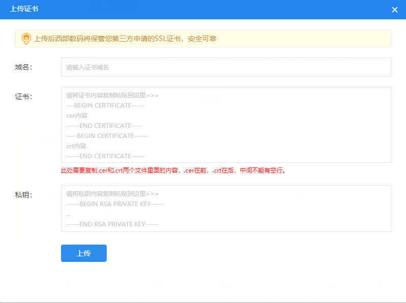 注意要nginx的證書(shū),證書(shū)文件可以直接用記事本打開(kāi),要復(fù)制粘貼正確的內(nèi)容。有些地方申請(qǐng)的證書(shū)是.pem格式,用記事本直接打開(kāi)復(fù)制內(nèi)容到證書(shū)欄。