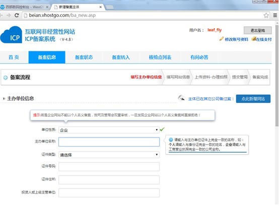 2.參照平臺(tái)提示填寫公司名稱、網(wǎng)站負(fù)責(zé)人信息、域名等資料,如下圖: